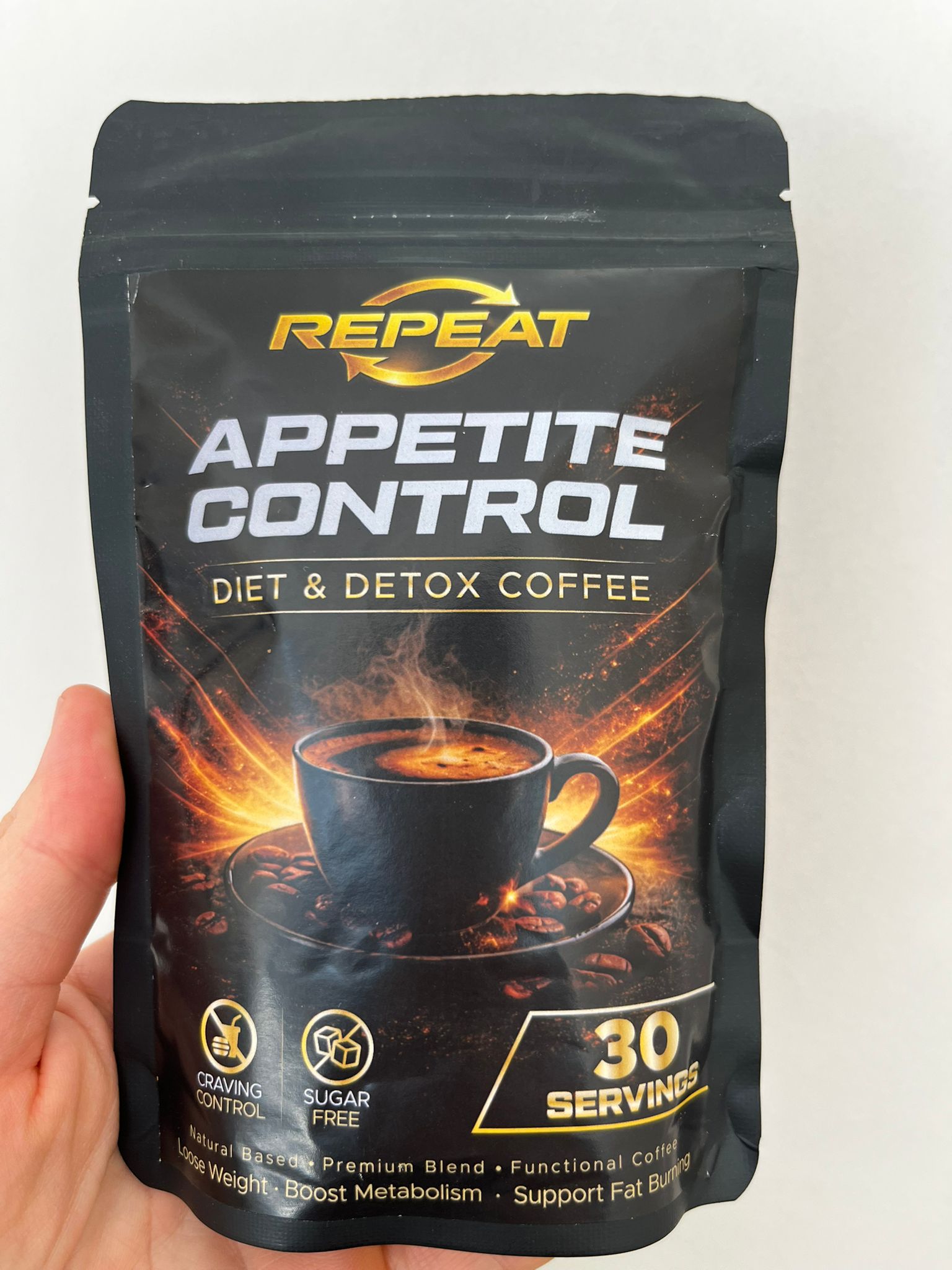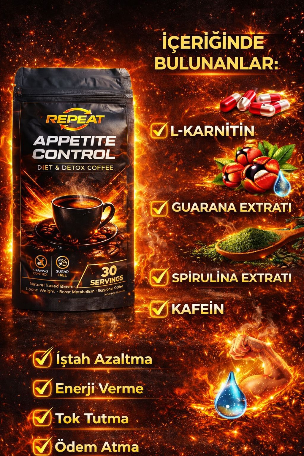 REPEAT Appetite Control diet ve detox kahvesi, günlük kahve keyfini fonksiyonel içeriklerle birleştirerek daha enerjik ve dengeli bir gün geçirmenize yardımcı olmak için özel olarak formüle edilmiştir. İçeriğinde bulunan L-Karnitin, Guarana Ekstratı, Spirulina Ekstratı ve Kafein, metabolizmayı destekleyen ve gün boyu enerjinizi korumanıza yardımcı olan güçlü bileşenlerdir.